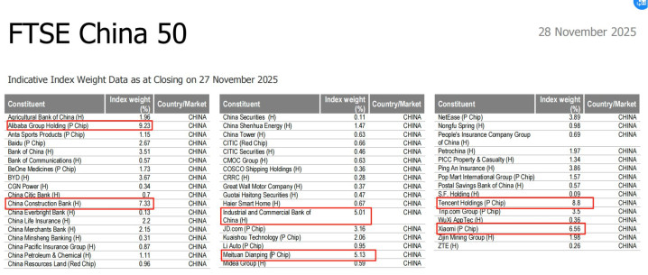 最后,再给大家简单介绍一下,此次调整成分股之前,富时中国50指数成分股权重占比较高的公司都有哪些。其中,阿里占比9.23%、腾讯占比8.8%、建行占比7.33%、小米占比6.56%、美团占比5.13%、工行占比5.01%。